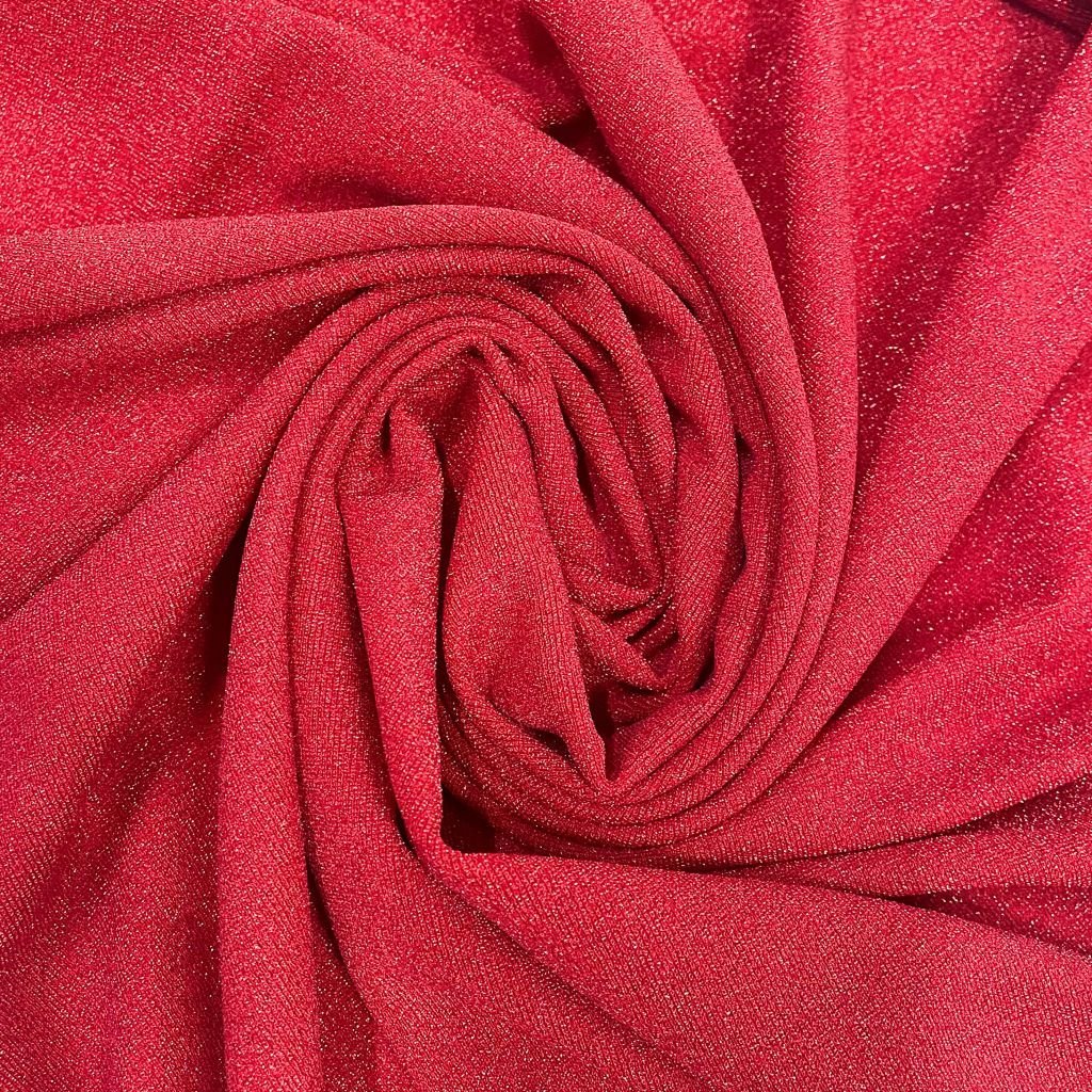 Вязанное трикотажное полотно, хорошо растяжимое. Люрексовая нить выведена на лицевую сторону, что придает ткани особый шик. Хорошо подойдет для пошива платьев, туник, футболок и другой легкой одежды. Не прихотлив в носке и уходе.