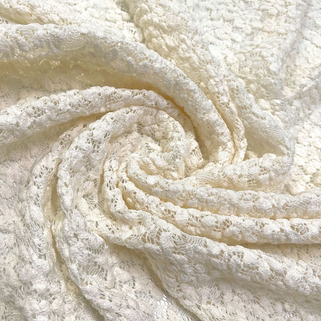 Стрейчевое кружевное полотно имеет очень хорошую растяжимость. Ткань имеет чуть более объемную лицевую сторону. Выткана единым полотном с цветочными мотивами. Хорошо стирается и практически не требует утюжки. Подходит для пошива праздничных нарядов для особых случаев, повседневной одежды, нижнего белья. Так же применяется для отдельных элементов платья.